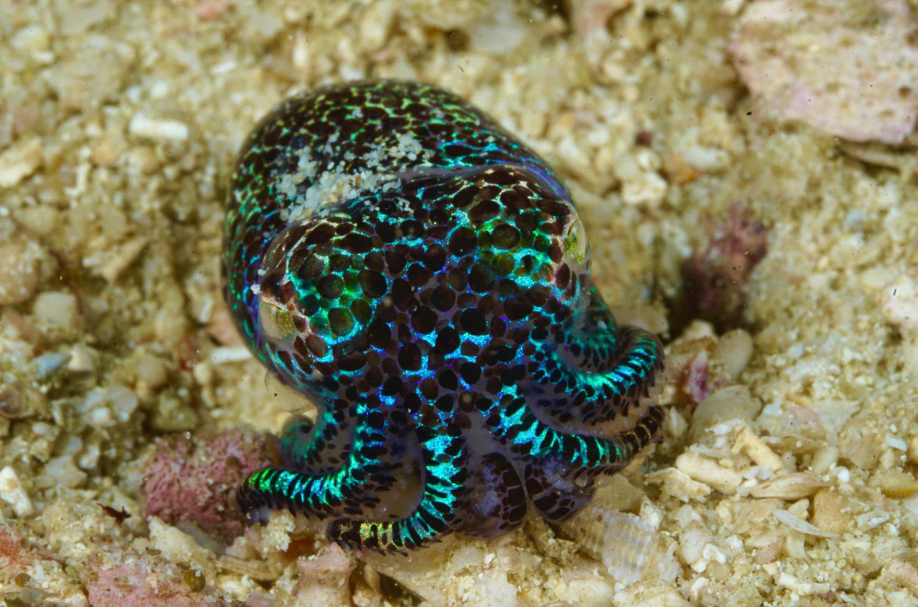 The Bobtail Squid (Euprymna species) is a tiny yet mesmerizing inhabitant of sandy seabe